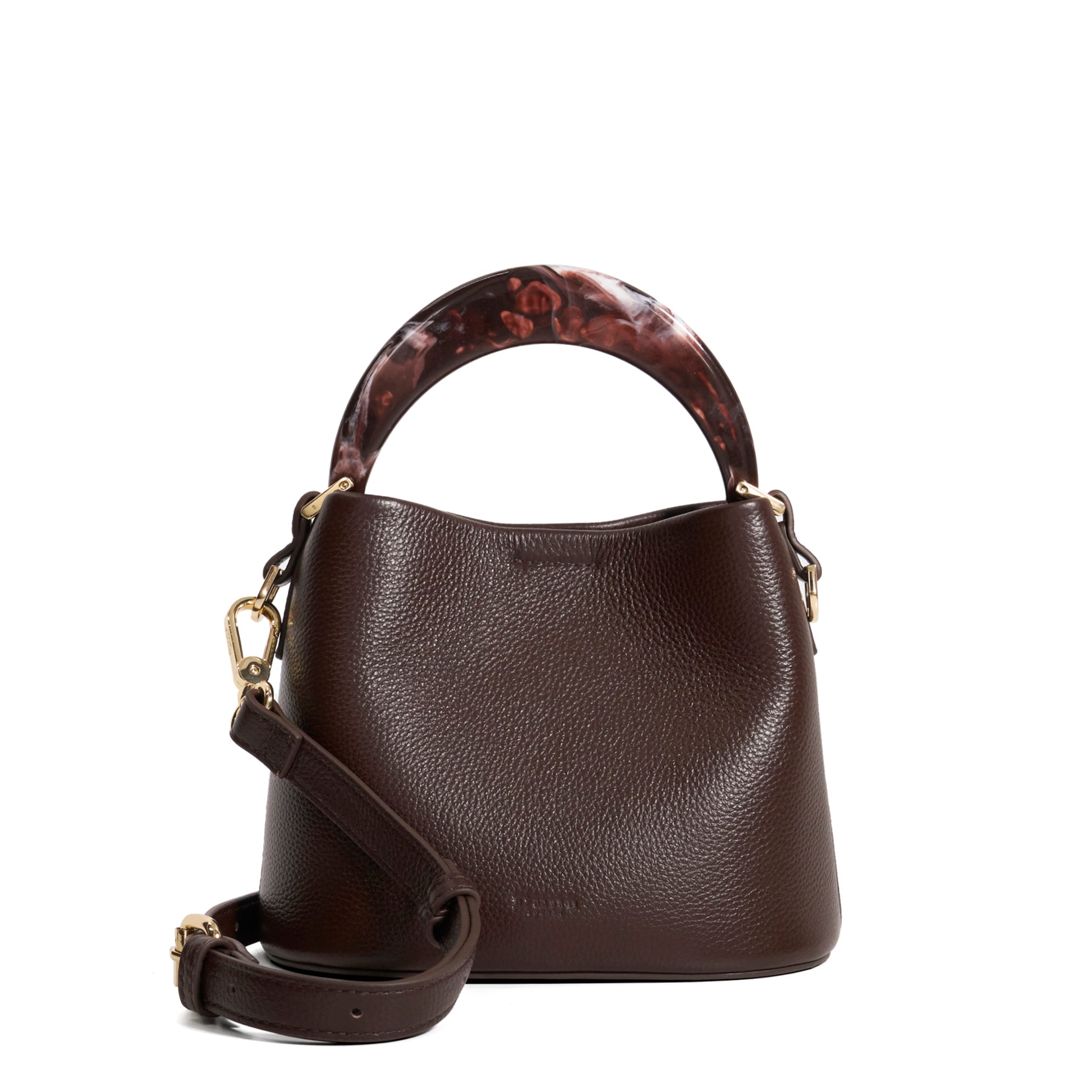 Elevated and elegant, Dharla is the epitome of understated luxury. Crafted from buttery soft leather, this refined handbag is defined by its structured circular resin top handle and gleaming gold hardware. The removable and adjustable cross-body strap allows for versatile styling—whether held in hand or worn effortlessly over the shoulder. A sophisticated statement for the modern woman.